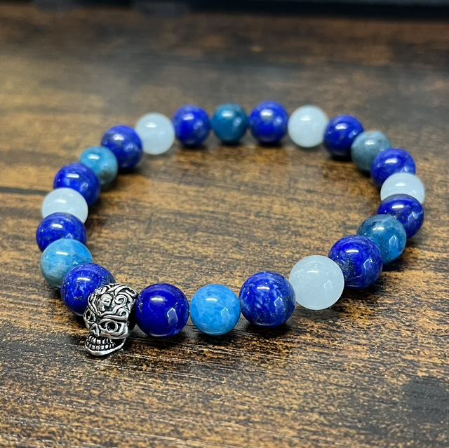 Apatite, Lapis-Lazuli et Aigue Marine - Tête de mort en argent 925